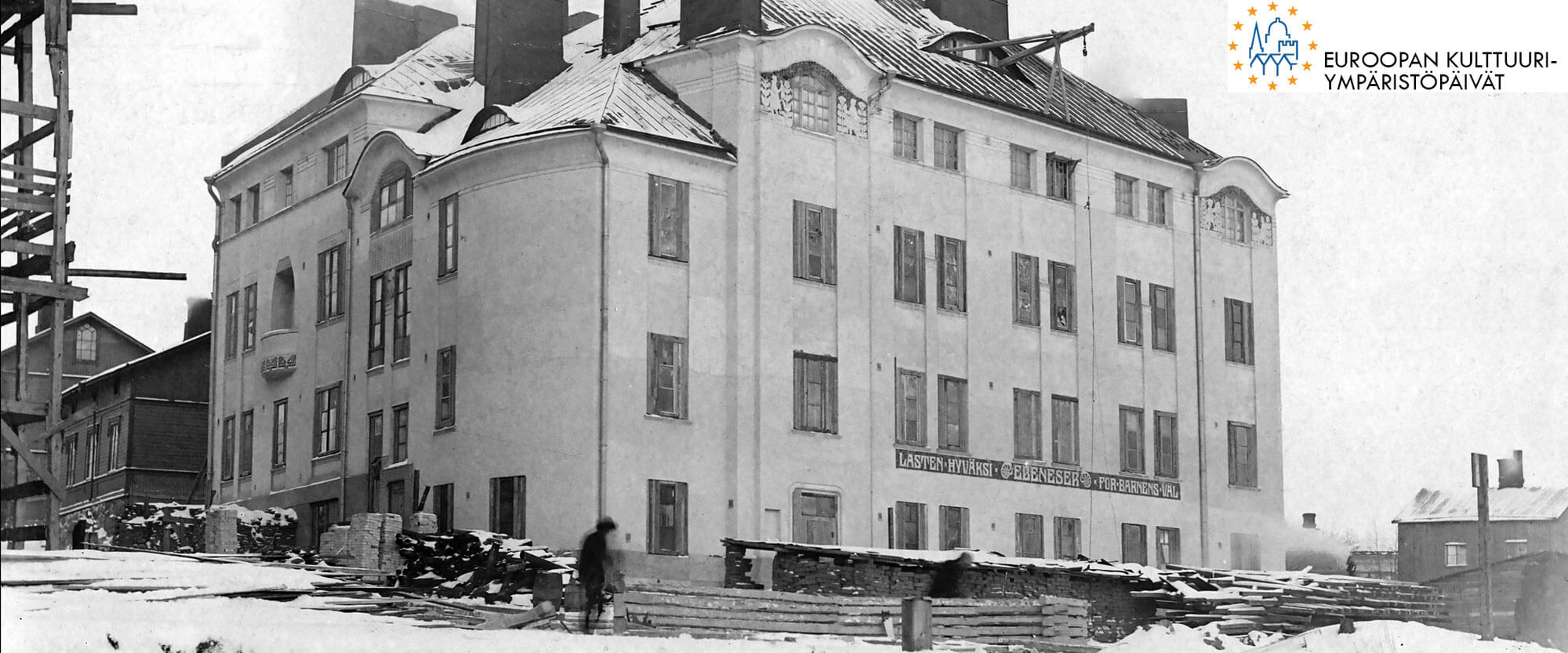 Otsikkokuvassa Ebeneser-talo lähes valmistuneena. Kuvan vasemmassa laidassa näkyvillä rakennustelineet Helsinginkatu 7 rakentuessa Ebeneserin viereen. Lastentarhamuseon valokuvakokoelma.